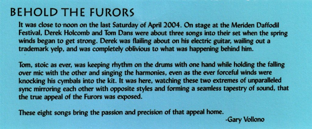 The Furors and ThinManMusic have good reason to celebrate the Release of ECCE FURORS. The Furors continue to be a treasure to New Haven musicians, writers and fans, and this disc is sure to please.